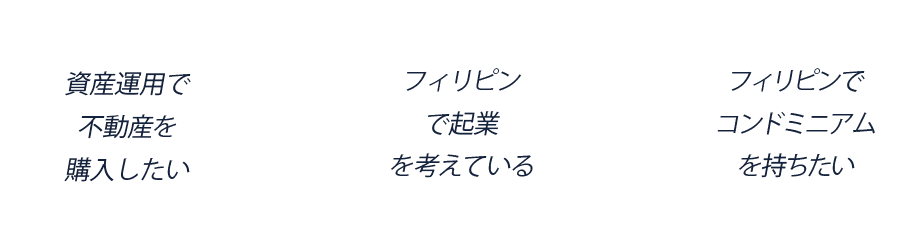 フィリピンの経済状況や資産運用の仕方など、また起業をしたいという企業様には銀行口座開設、就労VISAの手続きまで行なっております。